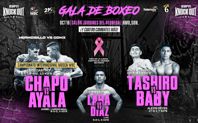 Los mexicanos Luis “Chapo” Castro y Ángel “Camaleón” Ayala, disputarán el título Internacional Plata mosca del Consejo Mundial de Boxeo, el próximo viernes 16 de octubre en el salón Jardines de Pedregal de Hermosillo, Sonora, en una atractiva cartelera que presentará 2M Promotions con transmisión internacional por ESPN Knock Out dentro del marco del mes de la lucha mundial contra el cáncer de mama.