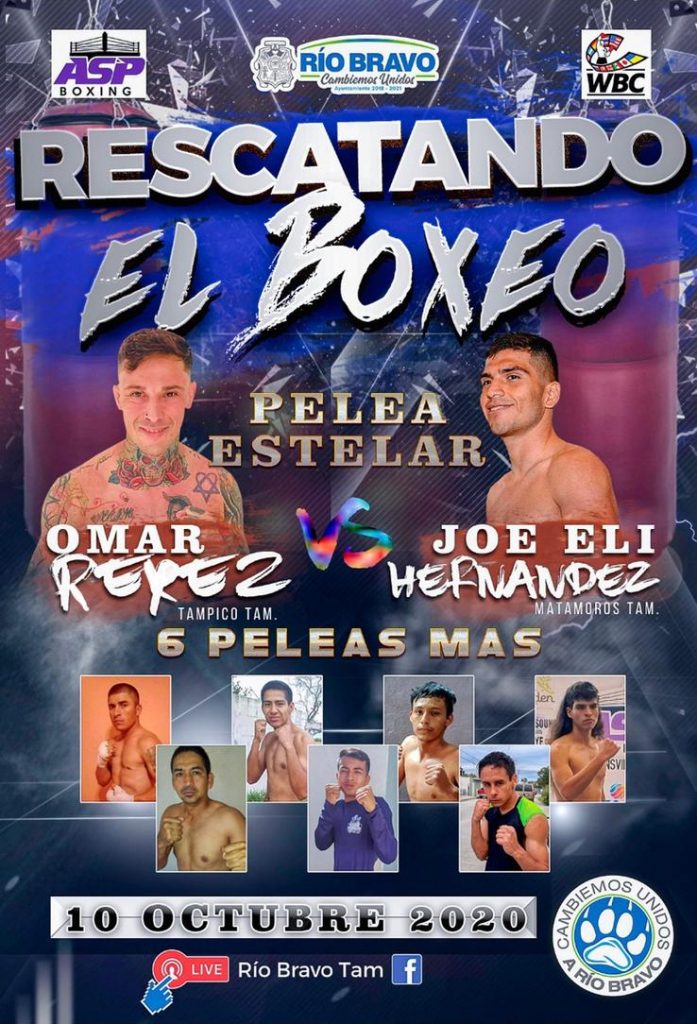 La cartelera “Rescatando el Boxeo” se realizará en la ciudad de Rio Bravo Tamaulipas, y se llevará a cabo a puerta cerrada y bajo los más estrictos controles de seguridad y sanidad. La pelea estelar será entre Omar Reyes y Joe Eli Hernandez y contará con otras 6 peleas profesionales. Todos los protagonistas de la cartelera superaron sin problemas los rigurosos exámenes médicos y el pesaje oficial.