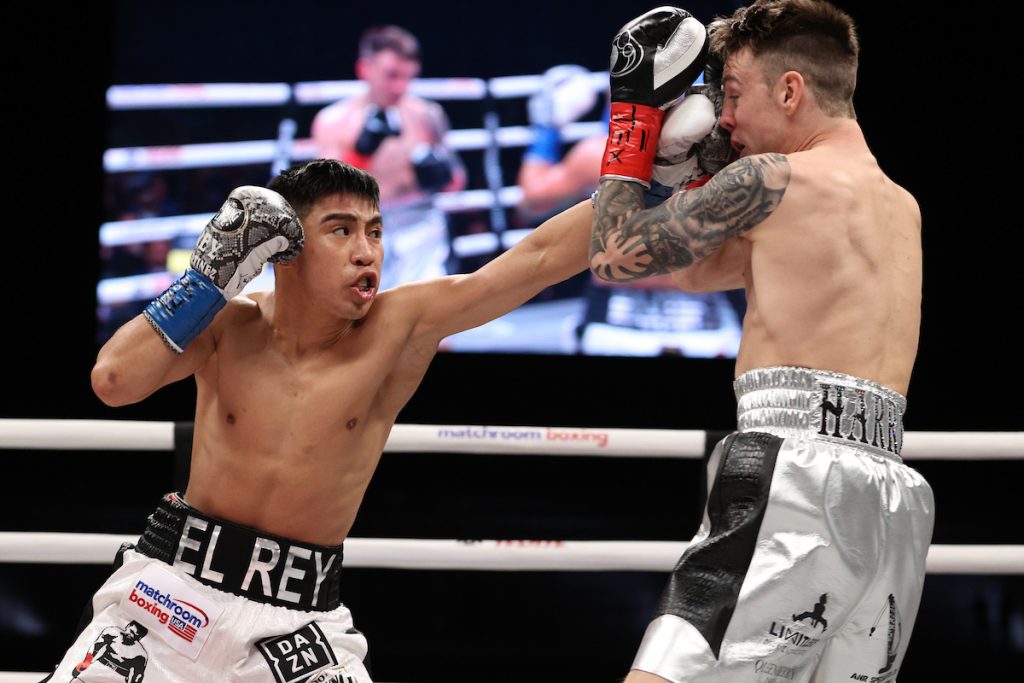 February 29, 2020; Frisco, TX, USA; Julio Cesar Martinez Aguilar and Jay Harris during their bout on the Matchroom Boxing USA card at the Ford Center at the Star in Frisco. Mandatory Credit: Ed Mulholland/Matchroom Boxing USA