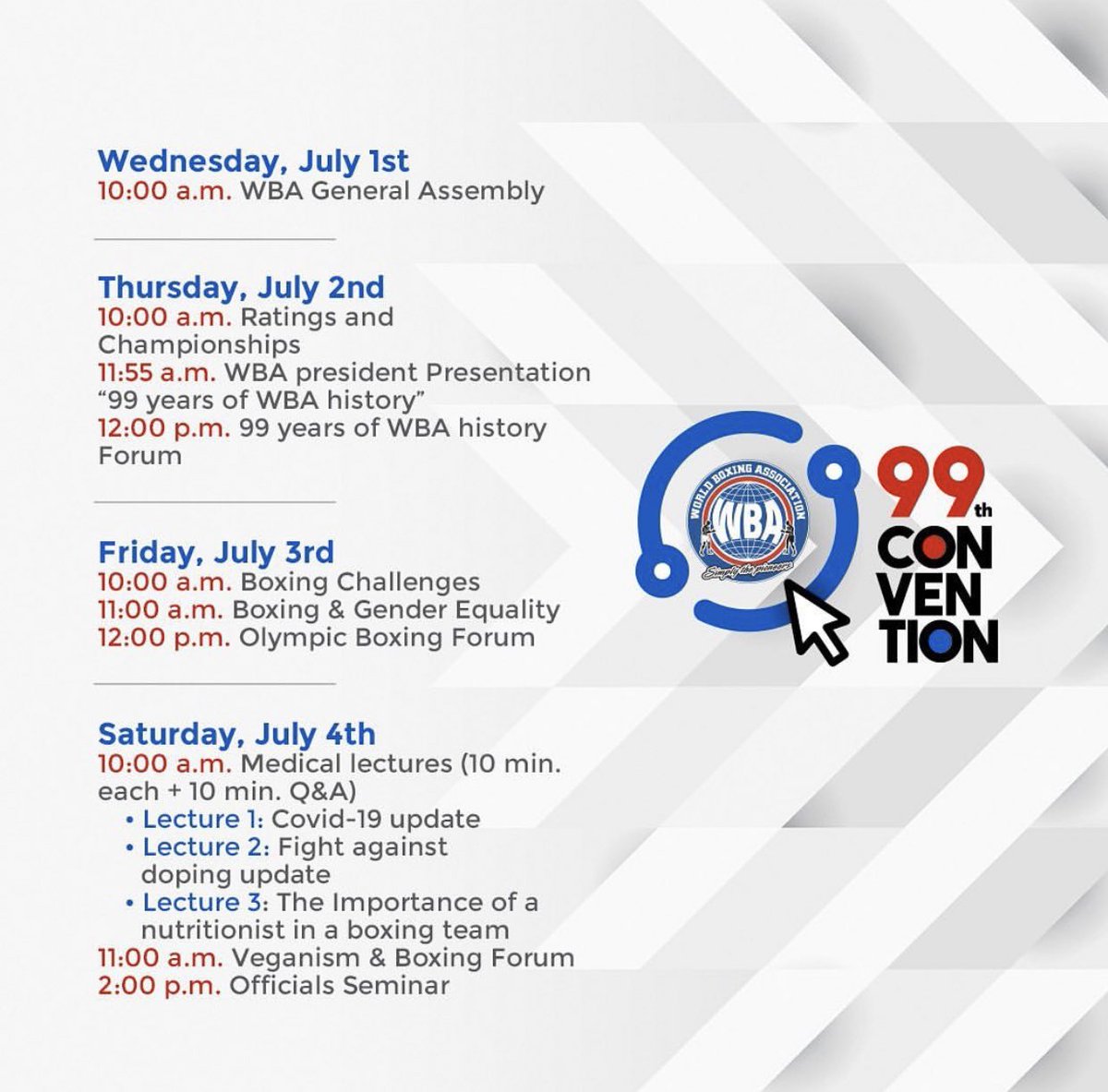 En el marco de los 100 años de historia que se cumplirán en 2021 para la AMB, se abrirá la convención número 99 este miércoles 1 de julio por primera vez de modo virtual dada la situación mundial y tendrá el plus de ser abierto para todo el mundo del boxeo y los fanáticos del deporte.