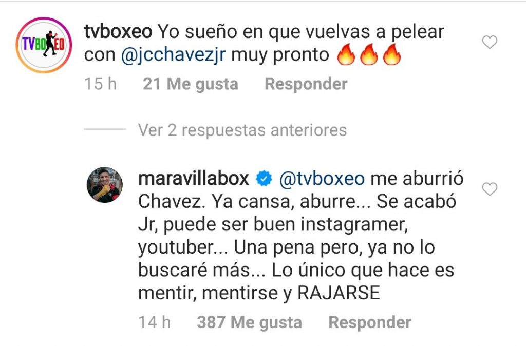 Pero el argentino también respondió, solo que no de una manera ofensiva o al menos no tan ácida como la previa declaración de Chávez Jr, y lo hizo en la cuenta oficial del sitio TV Boxeo.