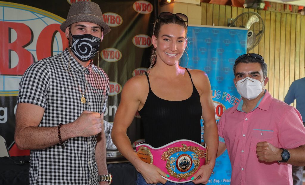 Los ex campeones mundiales José Pedraza y Alex “El Nene” Sánchez entregaron a Mayer el cinturón del título mundial que ganó oficialmente el sábado pasado en Las Vegas, al derrotar a la cinco veces campeona mundial de la OMB Ewa Brodnicka, de Polonia, por decisión unánime.