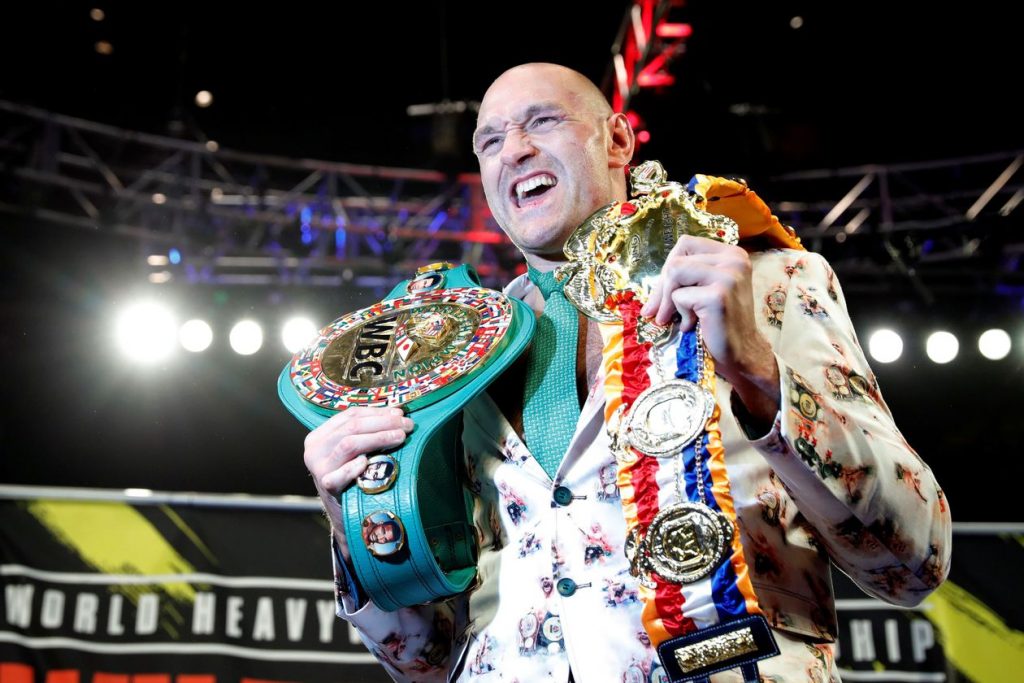 Boxing – Deontay Wilder v Tyson Fury – WBC Heavyweight Title – The Grand Garden Arena at MGM Grand, Las Vegas, United States – February 22, 2020 Tyson Fury poses with his belts during a press conference after the fight REUTERS/Steve Marcus TPX IMAGES OF THE DAY